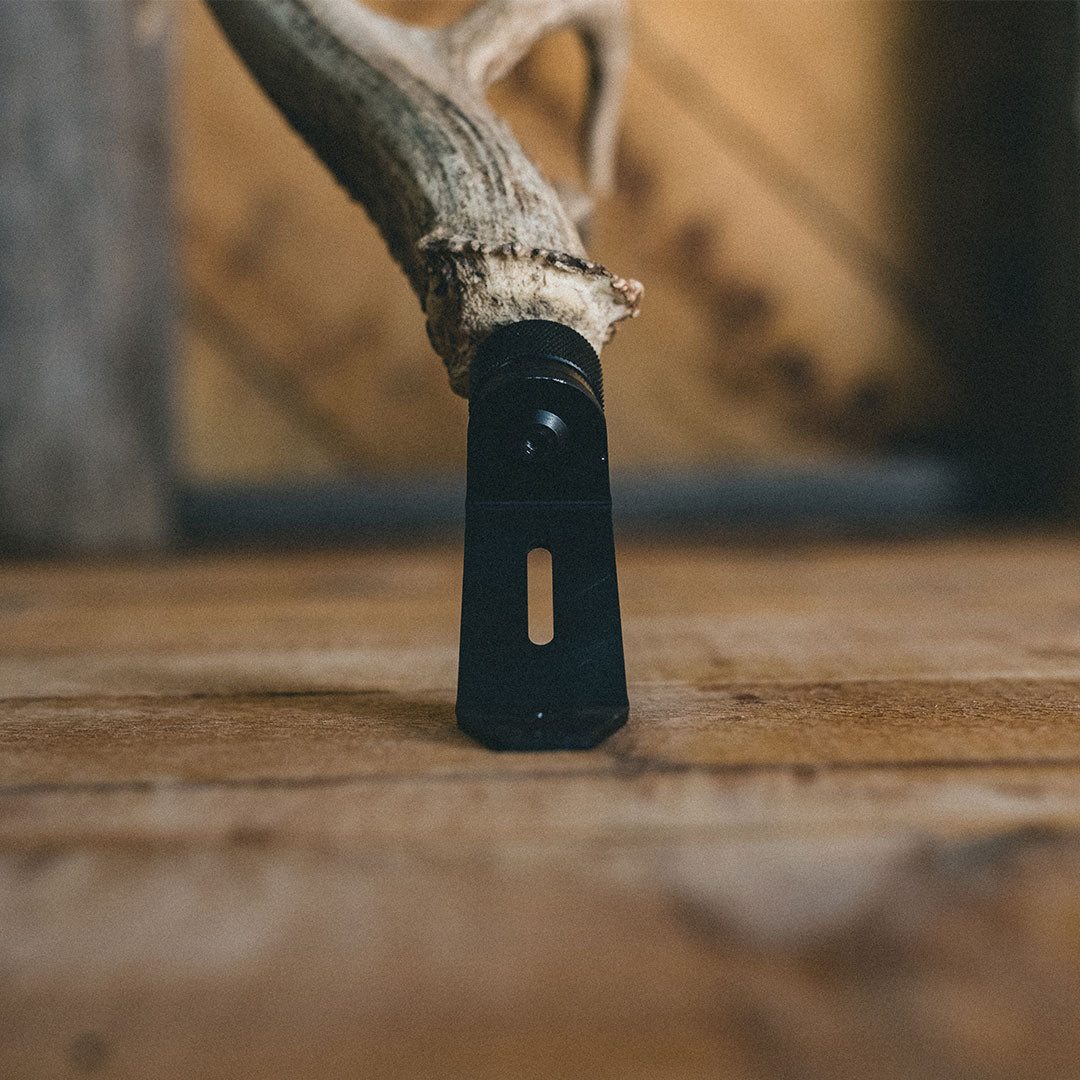 Often times, that matching antler just can't be found. Those bucks do a good job at hiding them. For this reason, we designed and manufactured the RH1 to show some love for that lonely shed. Yes, it's matte black and all metal (grinning smiley face). Like the RH2, the ball joint allows for that perfect position, and it can be locked in place with our knurled cap.
