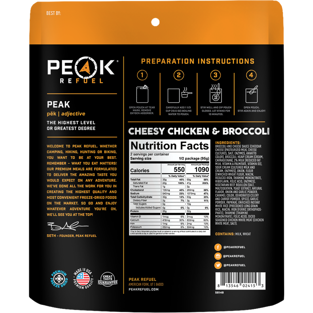 We’ve packed in 52 grams of protein using real chicken breast and cheesy sauce. And, because our ingredients are freeze-dried in one of the best facilities in the USA, our Cheesy Chicken & Broccoli is a must-have so you can recharge with whole ingredients that hit the spot.