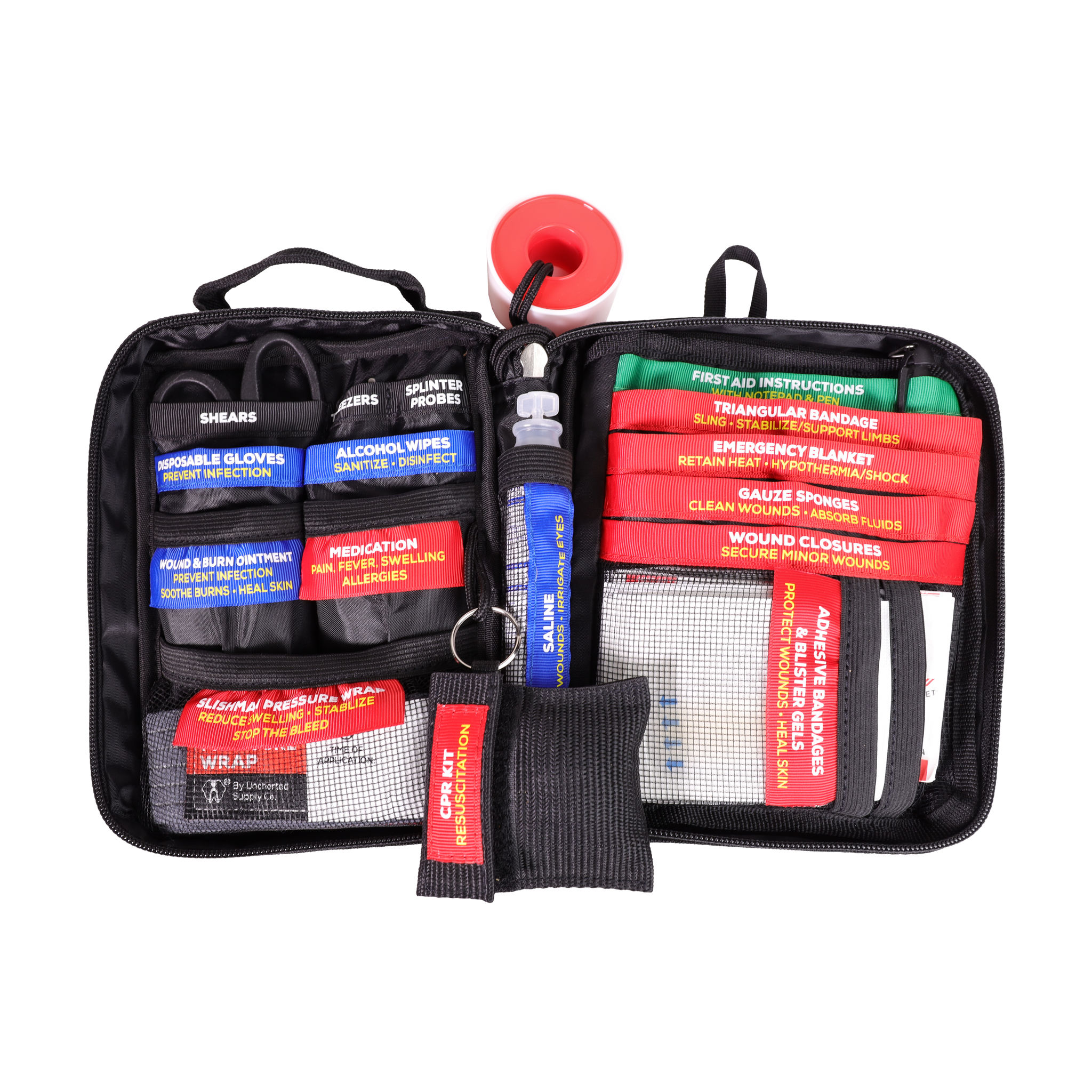 New and Included: Slishman pressure wrap, Sharpie, blister bandages, burn cream, triple antibiotic, Benadryl, Aspirin, and Ibuprofin