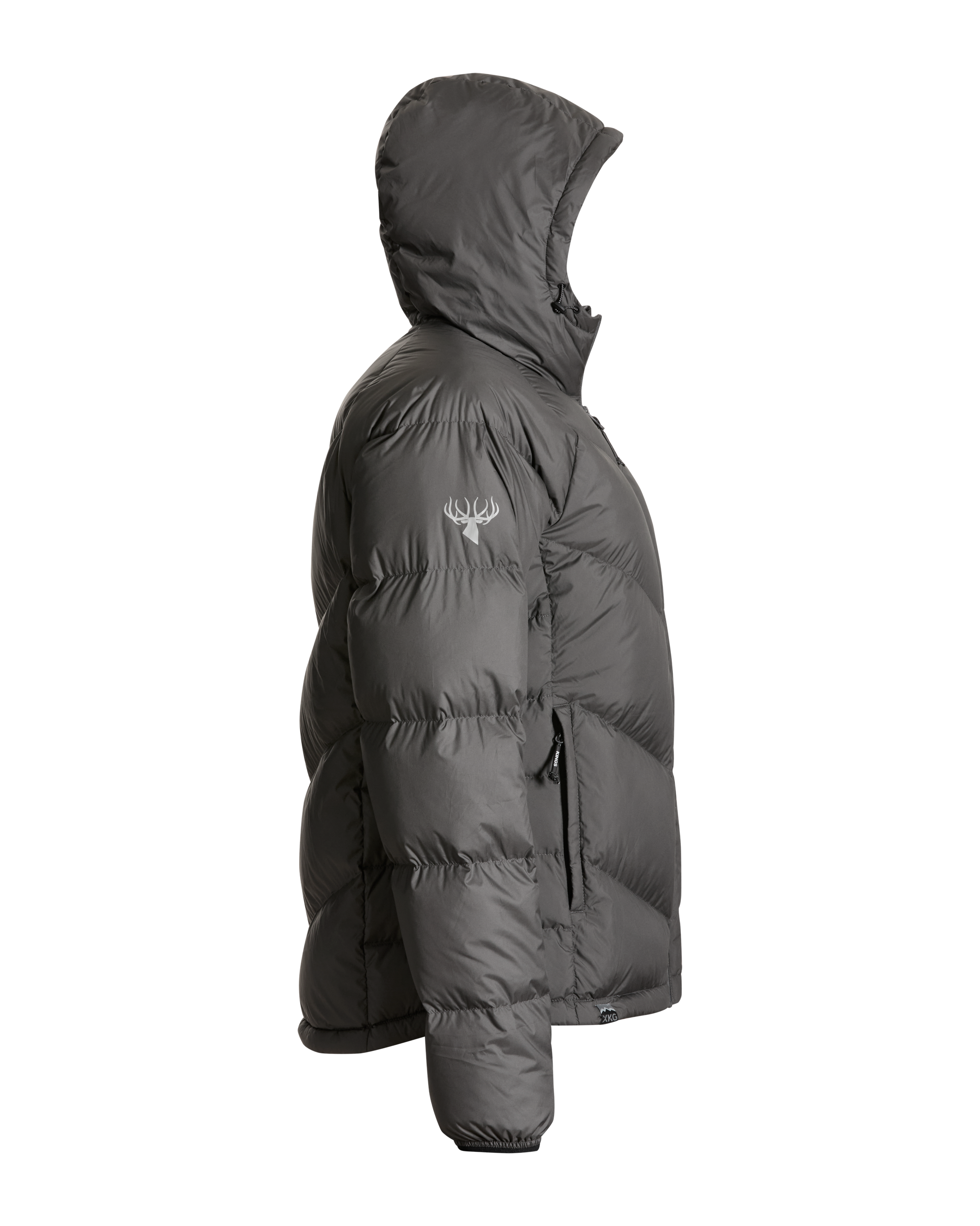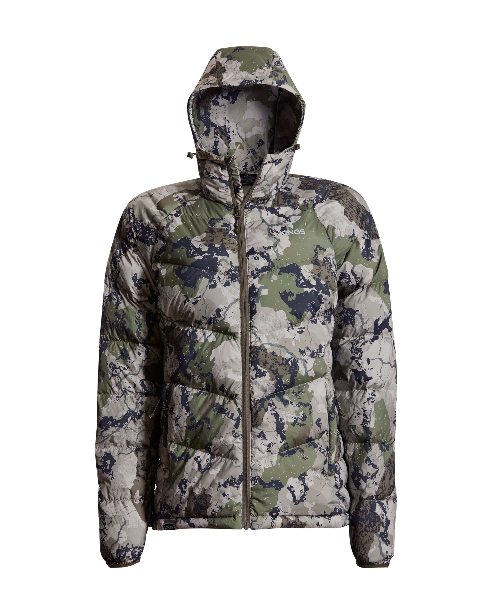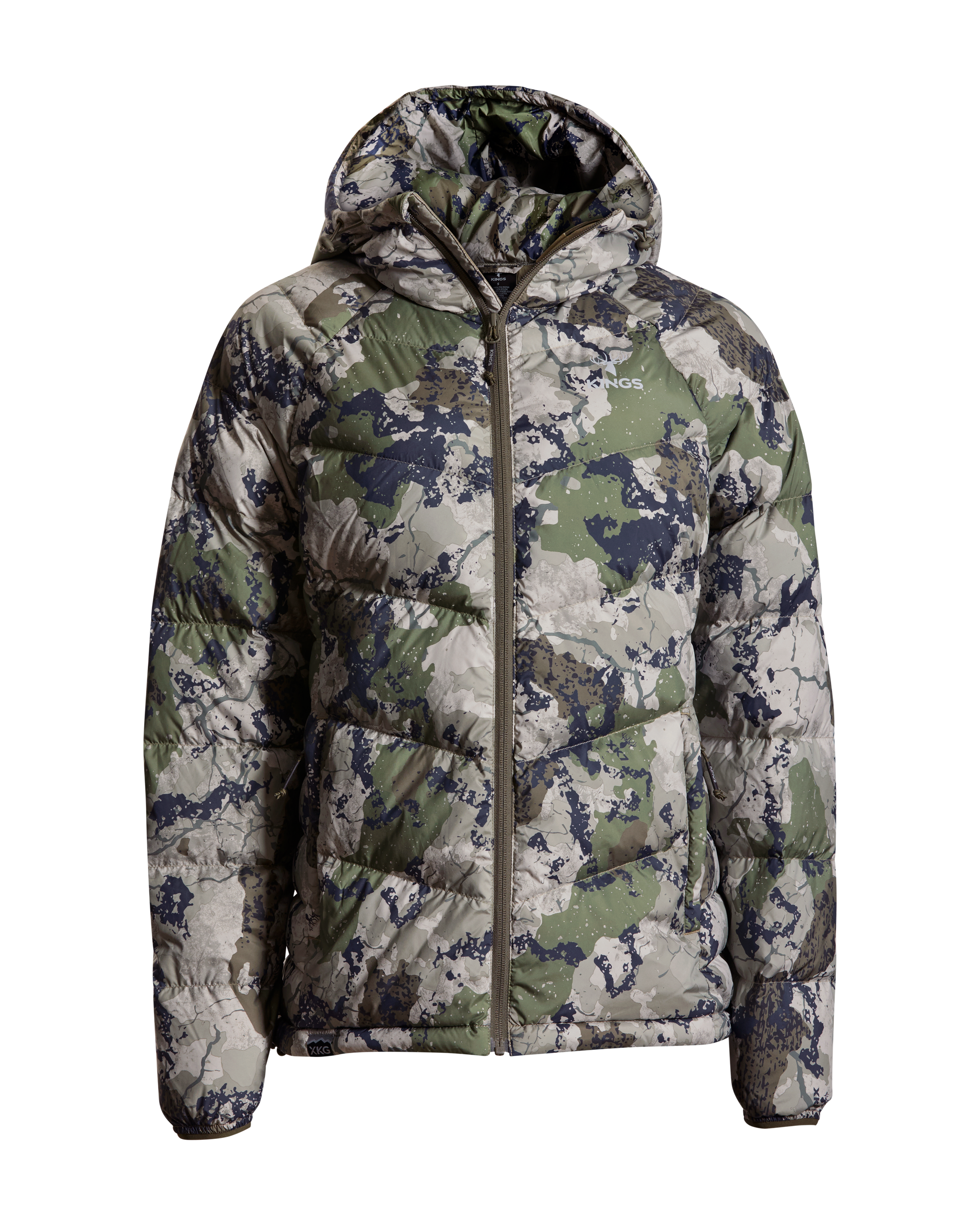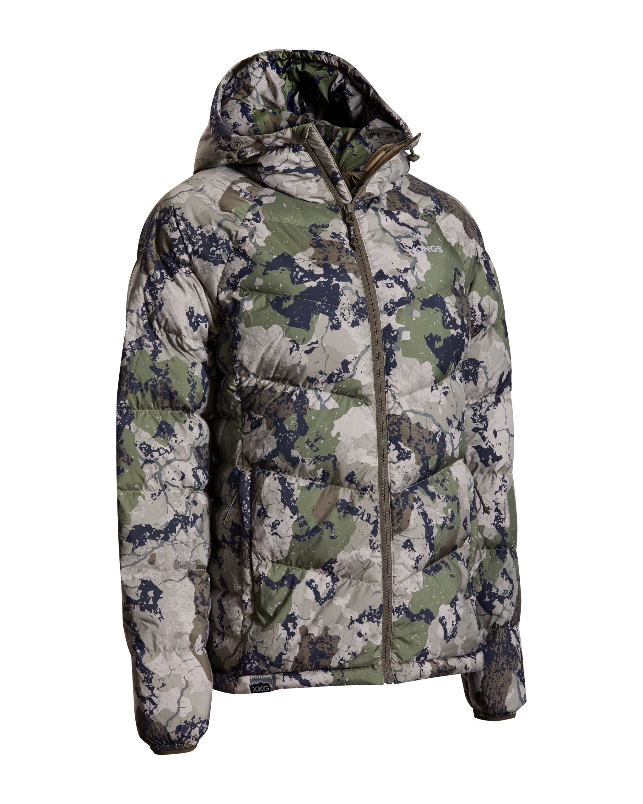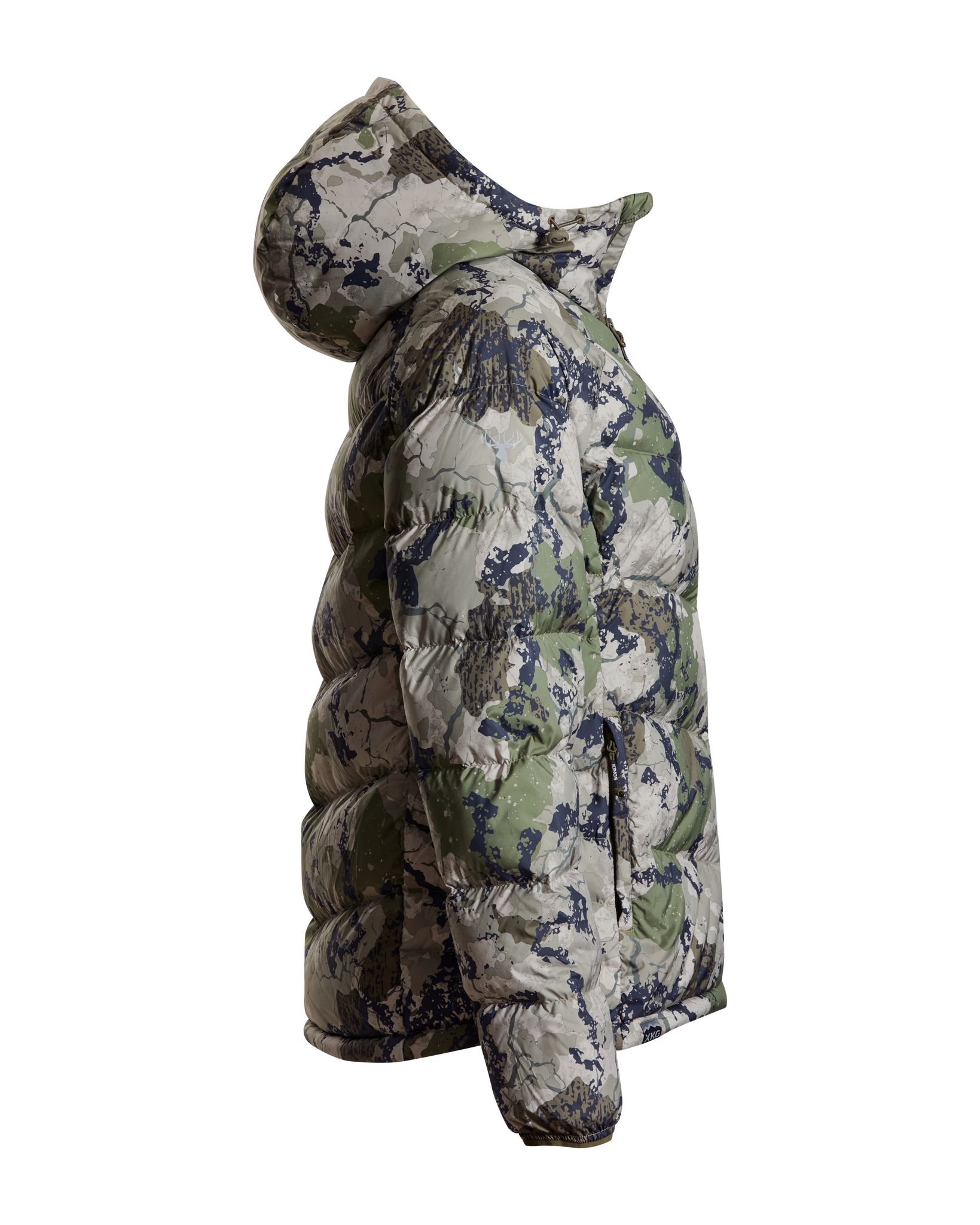 We’ve also added lightweight windproof polyester outer fabric along with a DWR finish to protect you even more when the conditions are extreme. This jacket packs into its left side pocket for easy storage. It has drawstring adjustments in the waist and hood to lock in heat more efficiently. Finished with XKG and Kings logoing on the pull tabs, chest and shoulders. This jacket will thrive during long glassing sessions, testing days in the tree stand, and sleeping or lounging around camp.