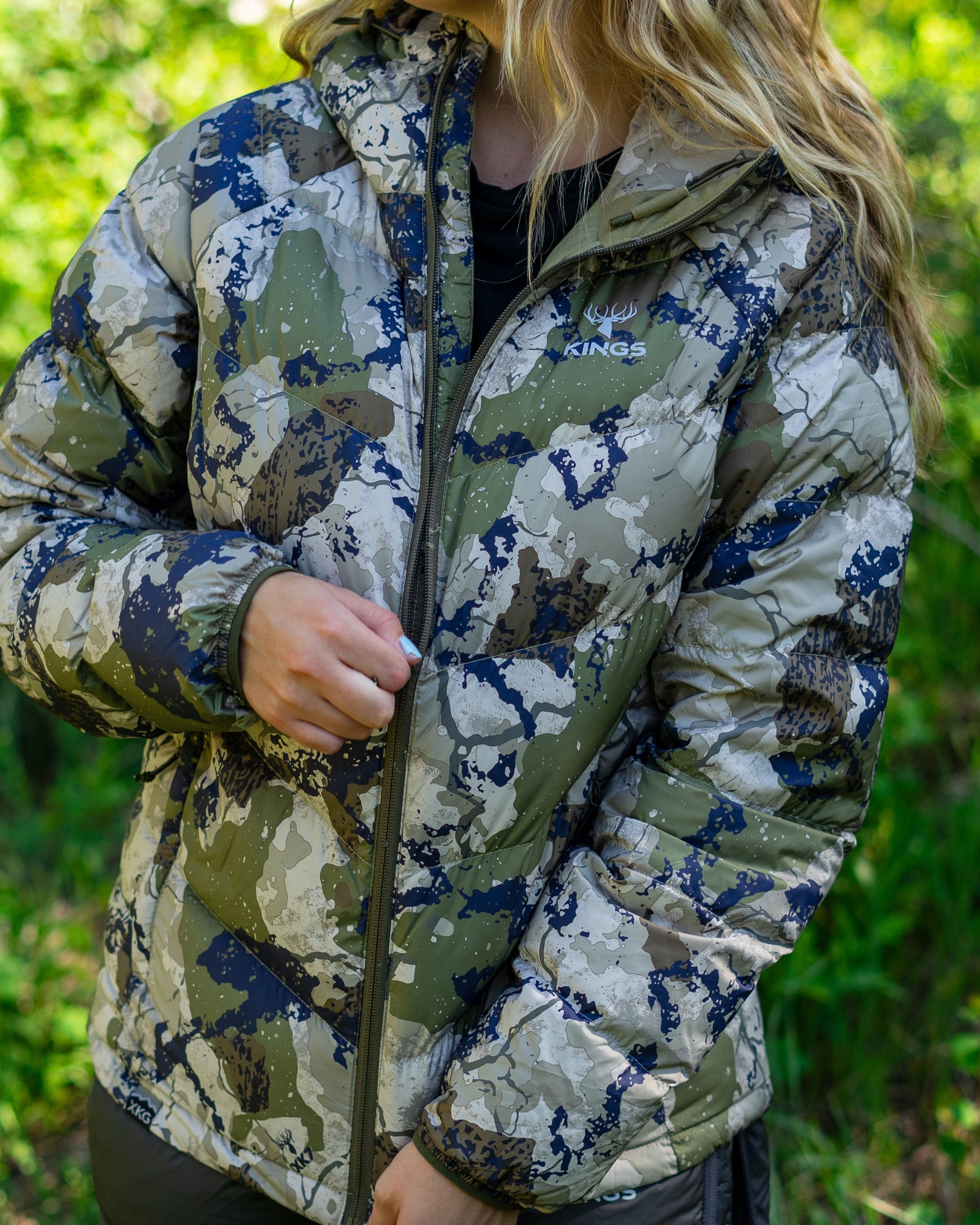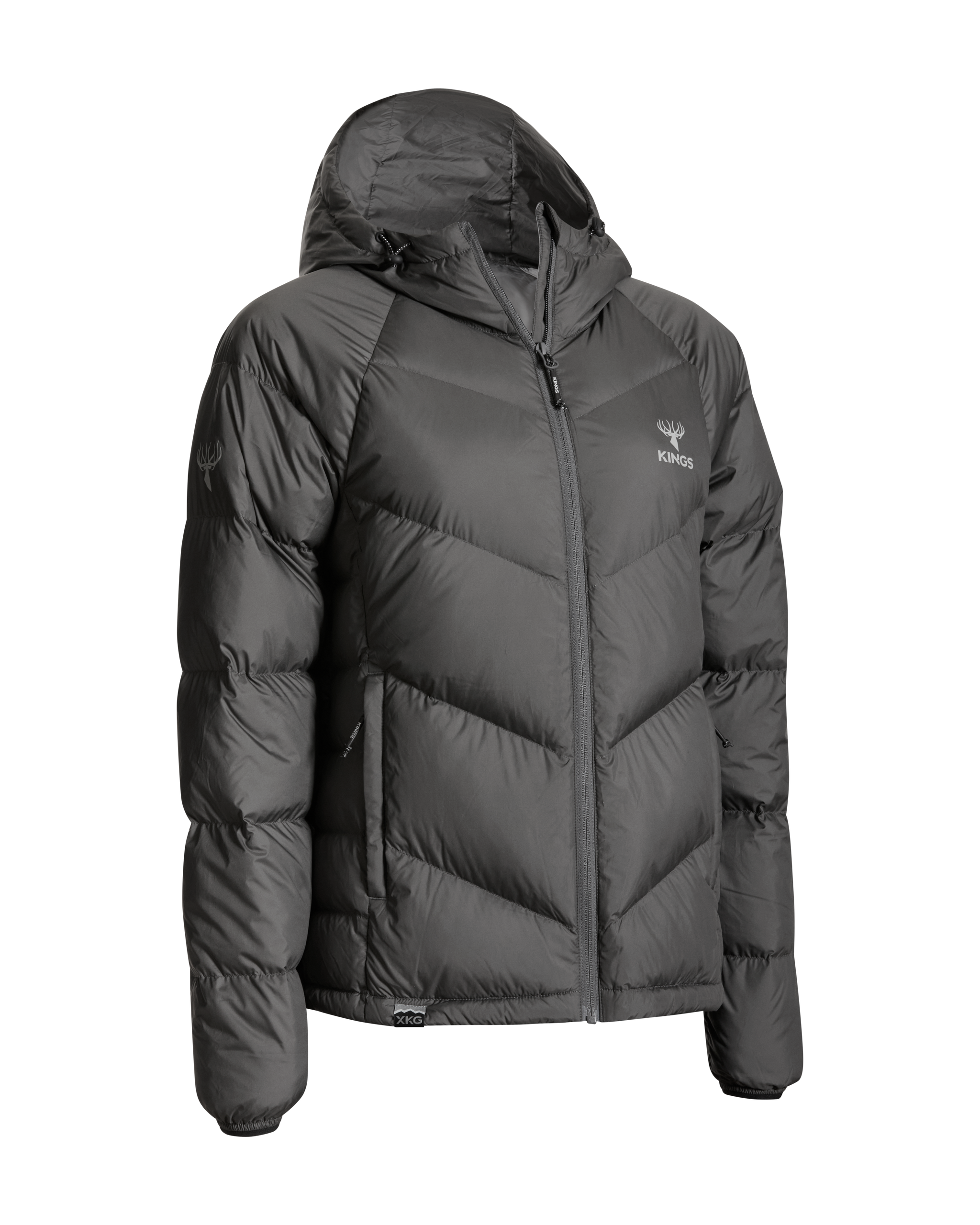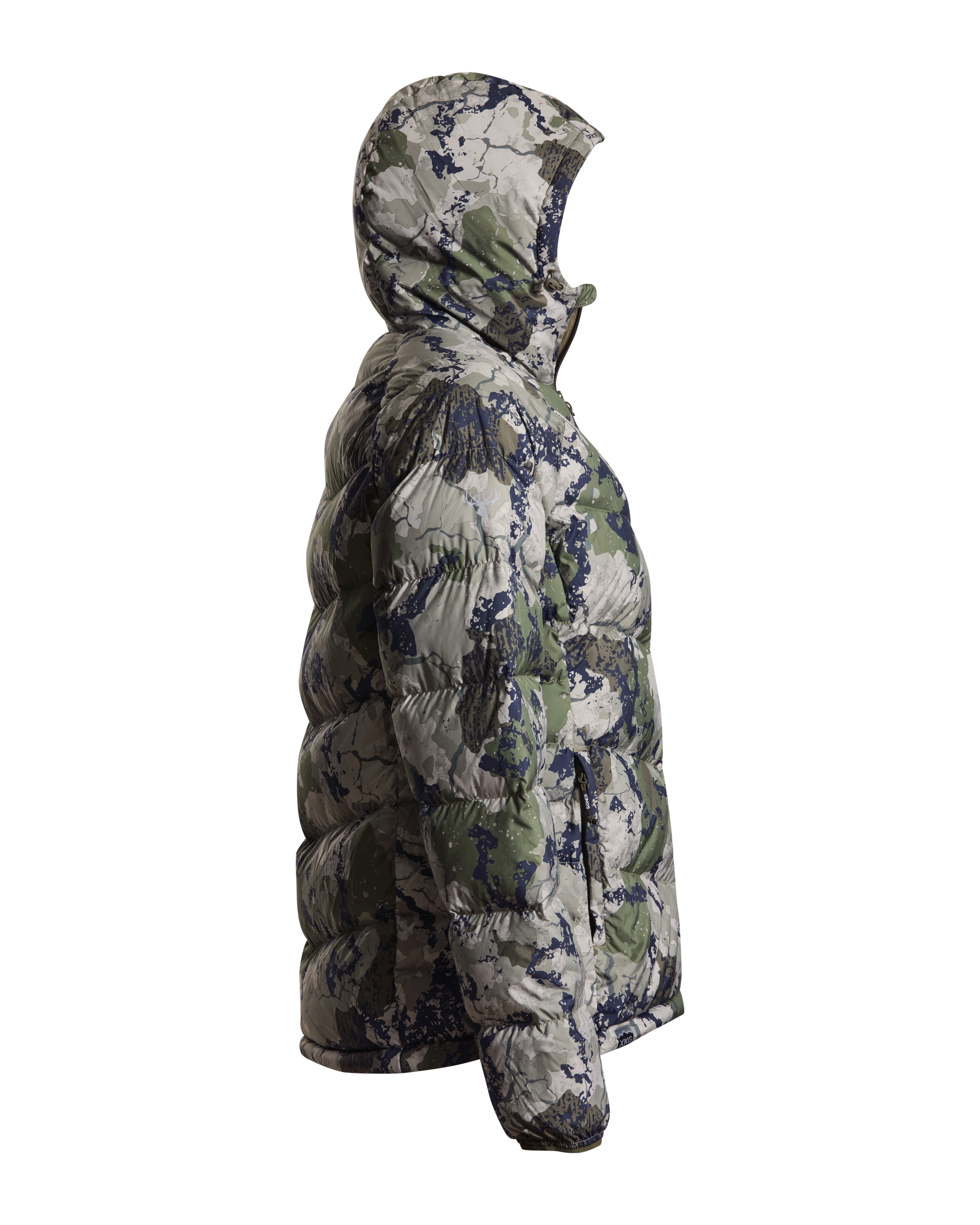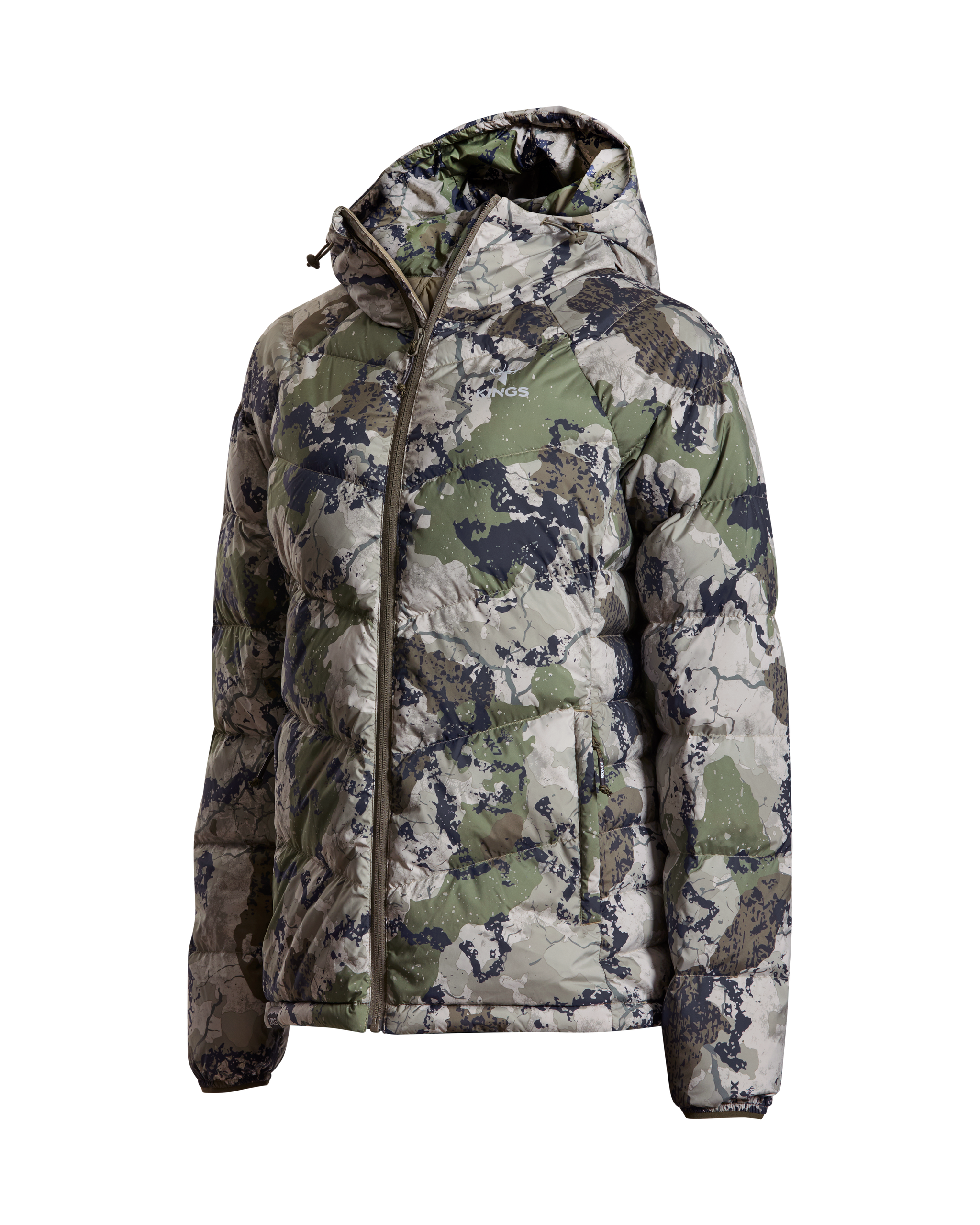 We’ve also added lightweight windproof polyester outer fabric along with a DWR finish to protect you even more when the conditions are extreme. This jacket packs into its left side pocket for easy storage. It has drawstring adjustments in the waist and hood to lock in heat more efficiently. Finished with XKG and Kings logoing on the pull tabs, chest and shoulders. This jacket will thrive during long glassing sessions, testing days in the tree stand, and sleeping or lounging around camp.